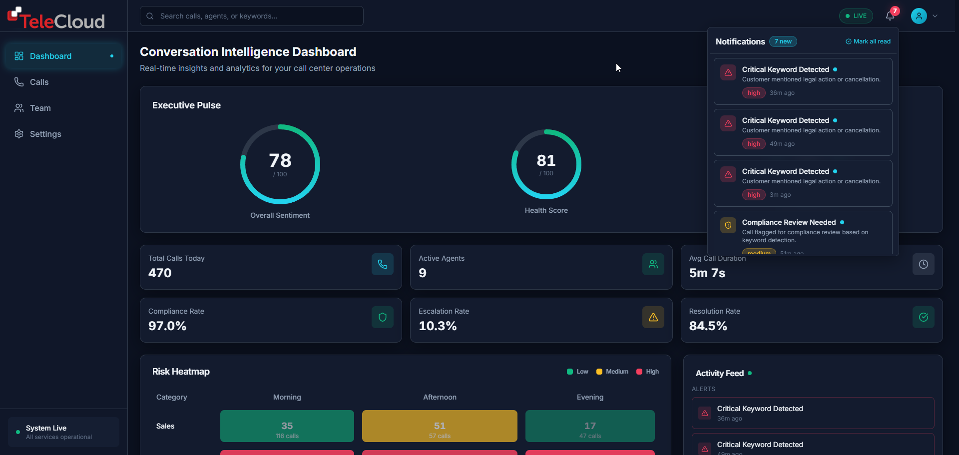 The dashboard acts as an early warning system. Spikes in negative sentiment or risky language are flagged before issues escalate.